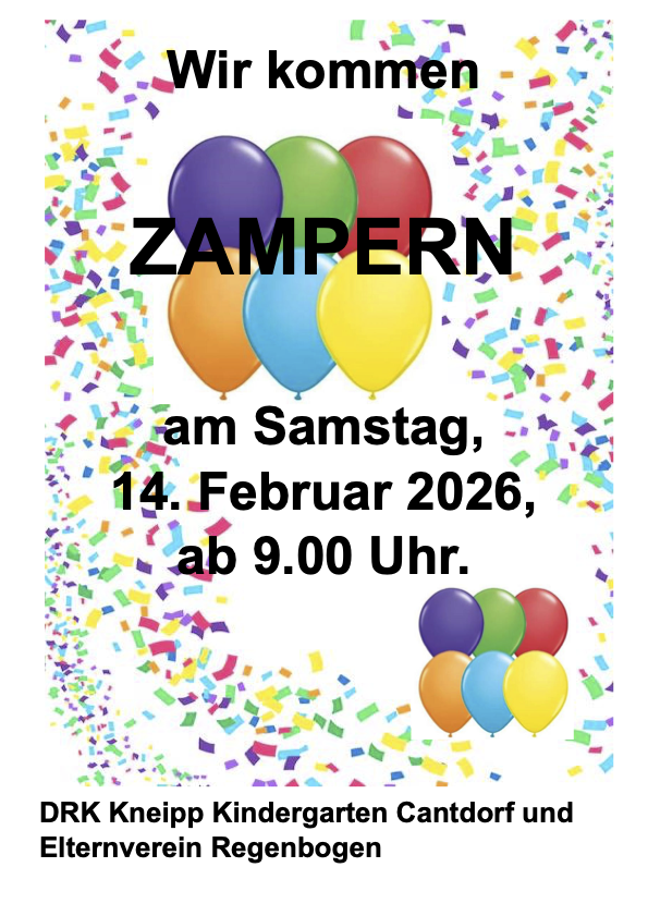 - Eine Minute - 93 WörterNachdem der Heimatverein am 07.02.26 gezampert hat, geht die Kindertagesstätte Cantdorf am 14.02.26 mit den kleinen und großen Kindern sowie den Eltern zampern.